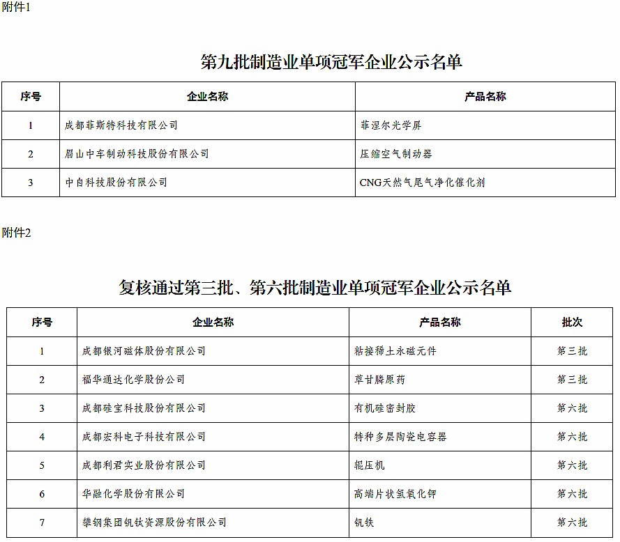 贯彻落实《关于加快培育发展制造业优质企业的指导意见》(工信部联政法〔2021〕70号)、《工业和信息化部办公厅关于开展2024年制造业单项冠军企业遴选认定和复核评价工作的通知》(工信厅政法函〔2024〕328号),按照工业和信息化部有关审查工作要求,现将四川省第九批制造业单项冠军企业名单(详见附件1),复核通过第三批、第六批制造业单项冠军企业名单(详见附件2)予以公示。